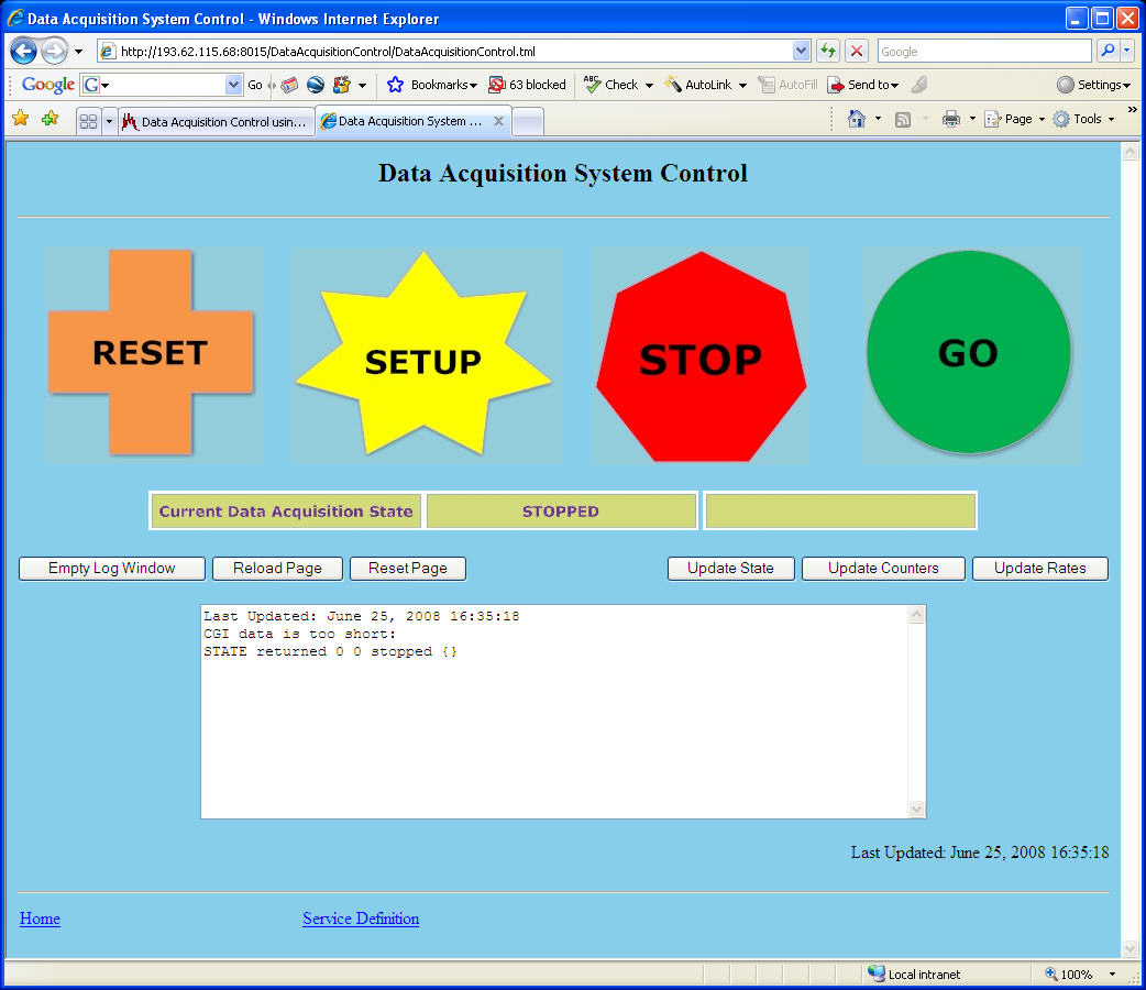 can't find package limit Running with default file descriptor limit /debug user "debug" password "ivms072etd 1" httpd started on port 8015 Cannot use /tmp/RunControlDemo/config/TclHttpd/nnsv/startup.tcl Cannot use /tmp/RunControlDemo/config/TclHttpd/localhost/startup.tcl /DataBaseAccessServer Message Logger using /tmp/RunControlDemo/log /MessageLoggerServer /DataAcquisitionControlServer Completed custom startup from /tmp/RunControlDemo/config/TclHttpd/startup.tclThe Httpd server is now running and the DataAcquisitionControl Service is now available. You can check the server by using a Web Browser and connect to http://localhost:8015 (or appropiate if the browser is running in a remote system).The browser window looks like this.