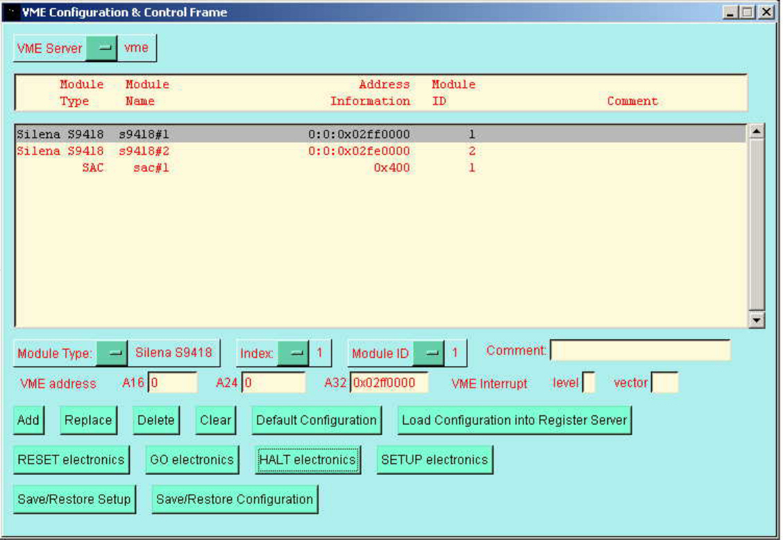 All VME modules (S9418 adcs; CAEN adcs/tdcs and the Acquisition Control module) must first be configured correctly by installing