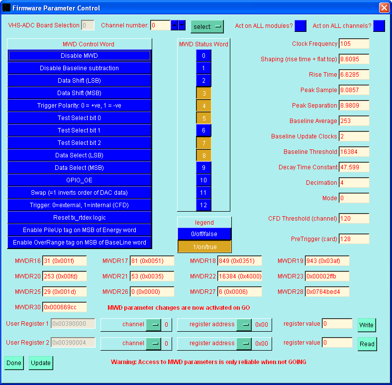 The MWD parameters can only be examined and changed while data acquisition is STOPPED.