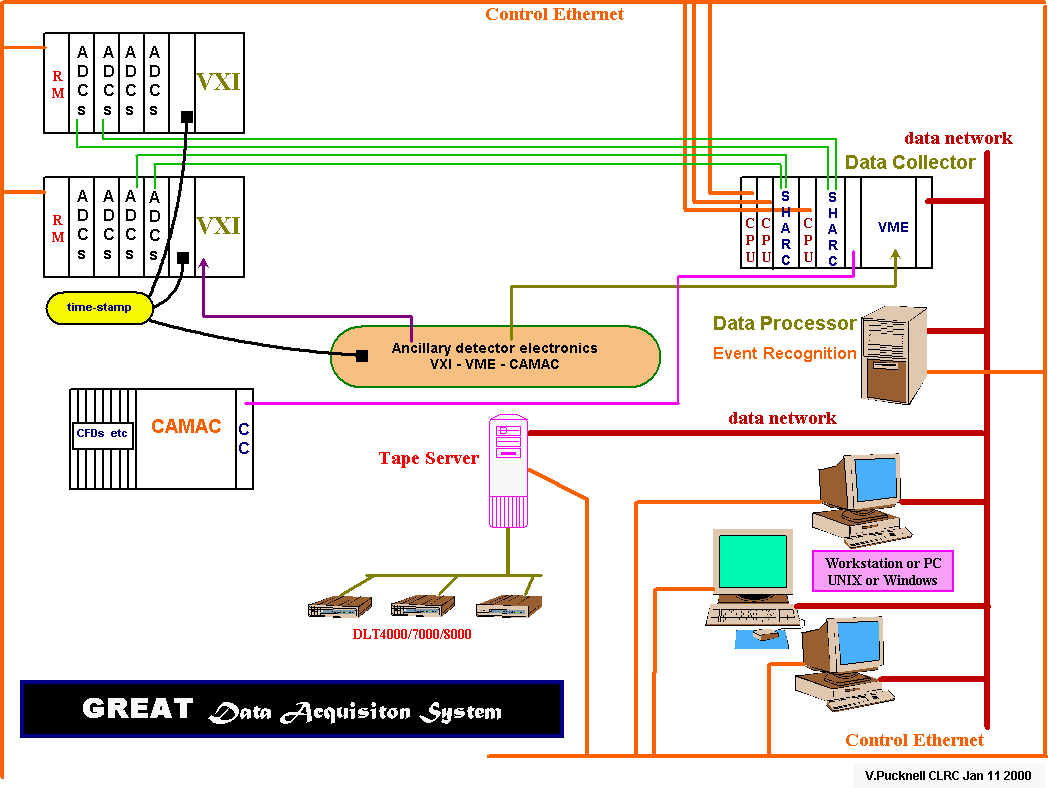 Here is a diagram which shows the components of the data acquisition system and the interconnections. The data flow follows the data links (green) from the VXI crates to the data collector. The data collector transmits data to the data processor via the data network (red). The formatted data is then broadcast via the data network (red) to the tape server where it is written to tape. The user interface, control and online data analysis is from the cluster of workstations and PCs via the control ethernet (orange).